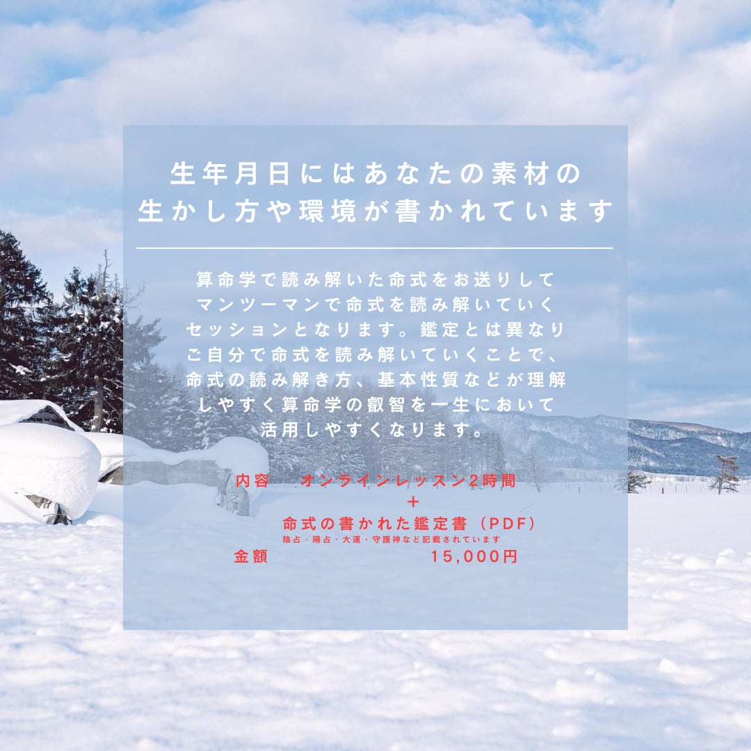 内容 オンラインレッスン(2時間)+命式の書かれた鑑定書送付金額 15,000円